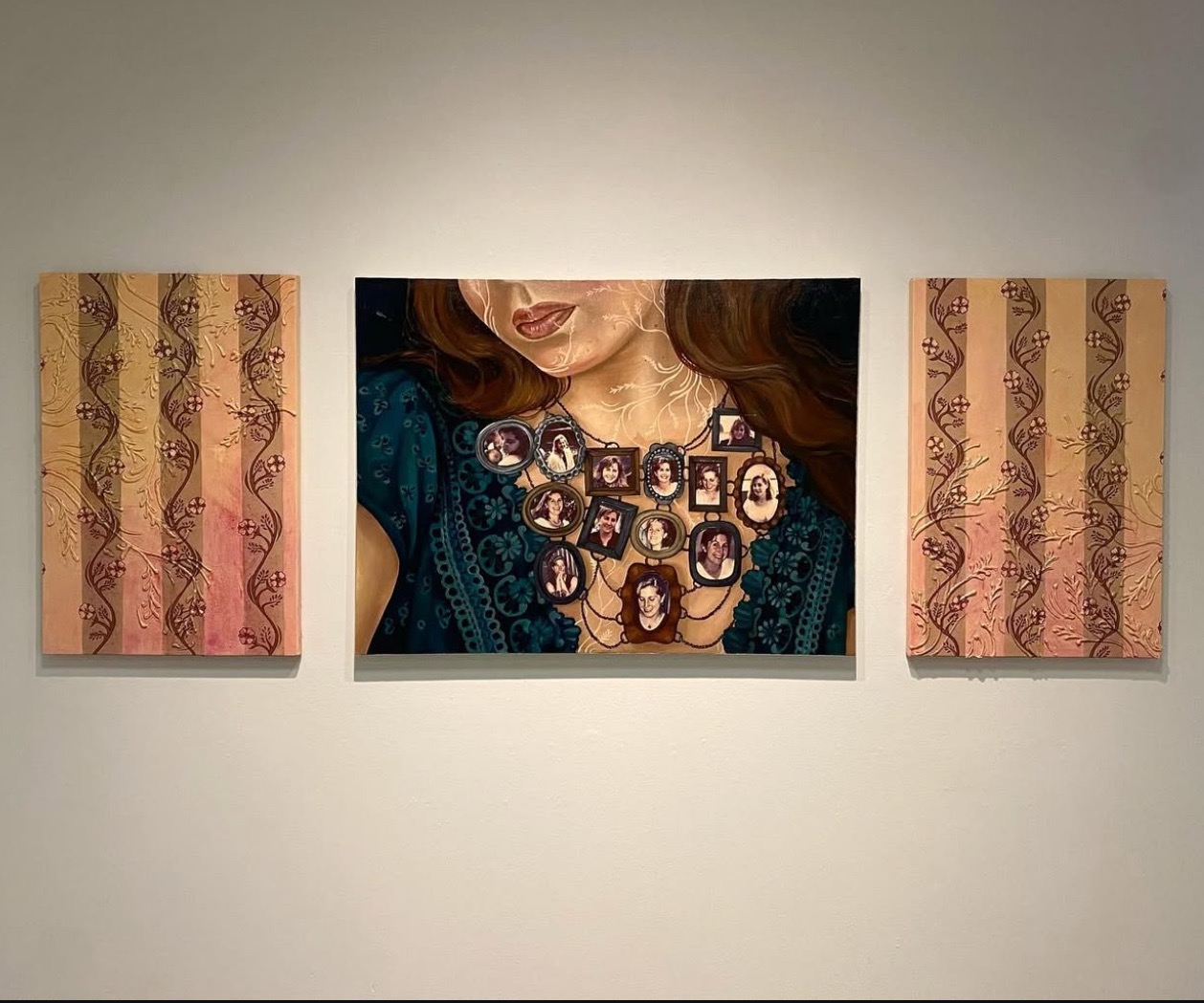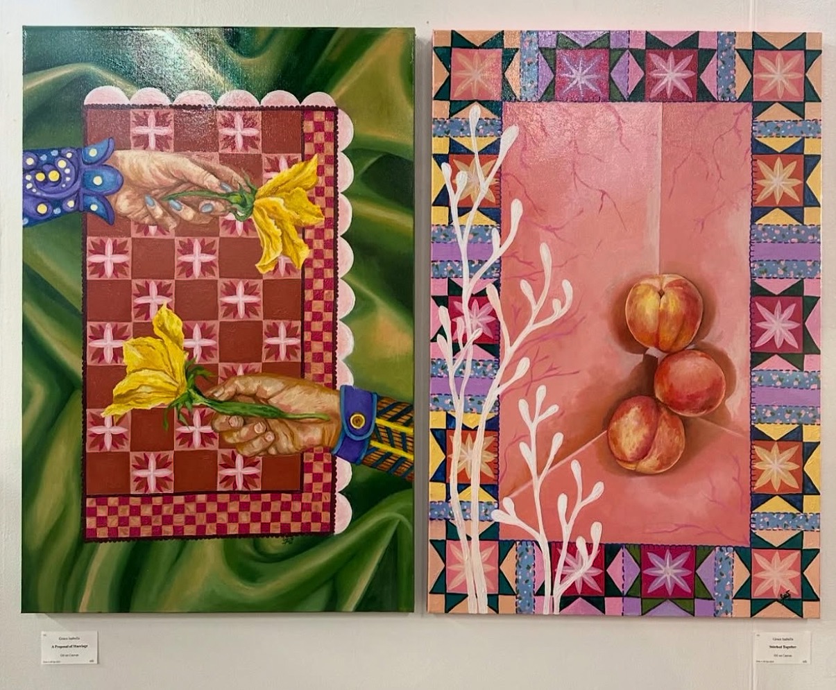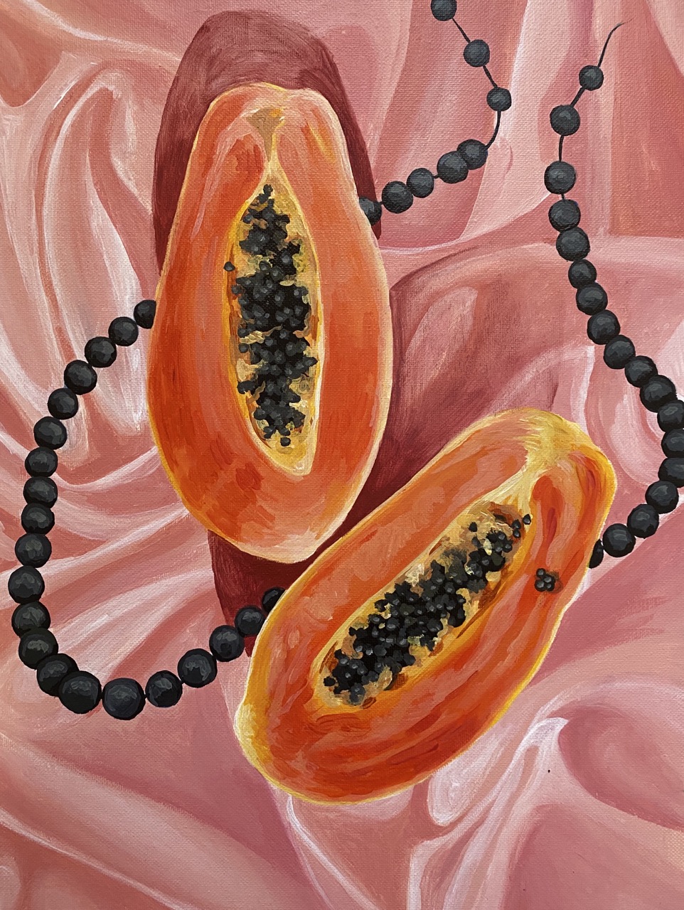 Influenced by craft-based arts and traditional techniques, her work draws from a long lineage of handmade practices while remaining deeply personal and contemporary. She views the world through a feminine lens, often engaging with traditionally feminine subject matter such as flowers, textile patterns, and fruit as portraiture. These motifs become a way to explore identity, care, and quiet strength.